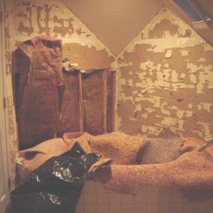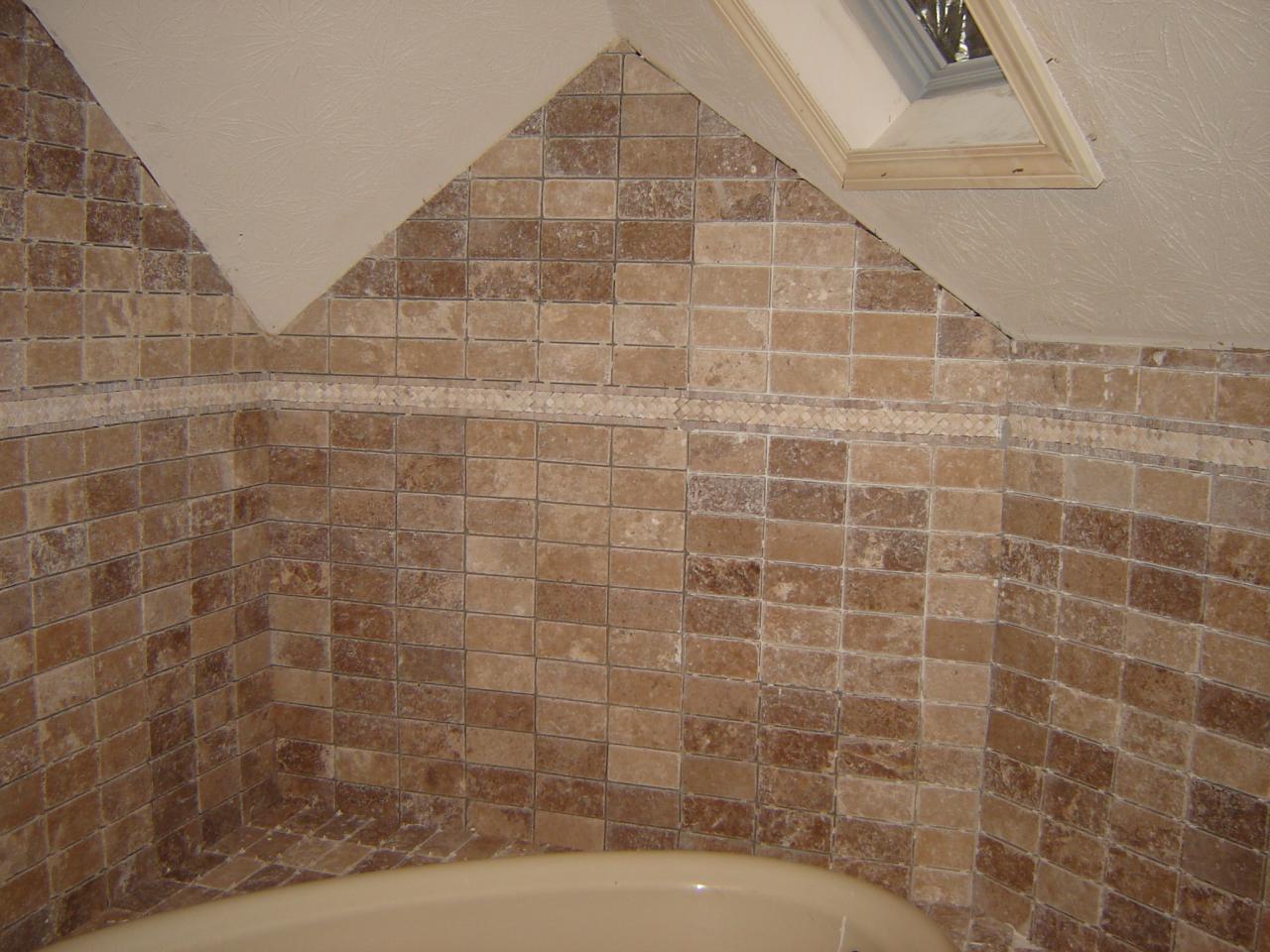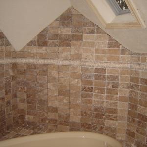 The "Before" image shows wall around the tub in the master bath after the original wall covering was removed. The "After" picture shows the same wall surround with travestine stone tiles installed.