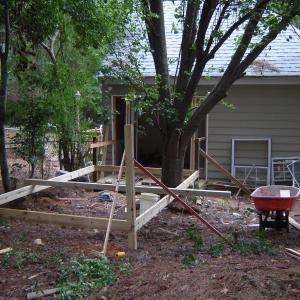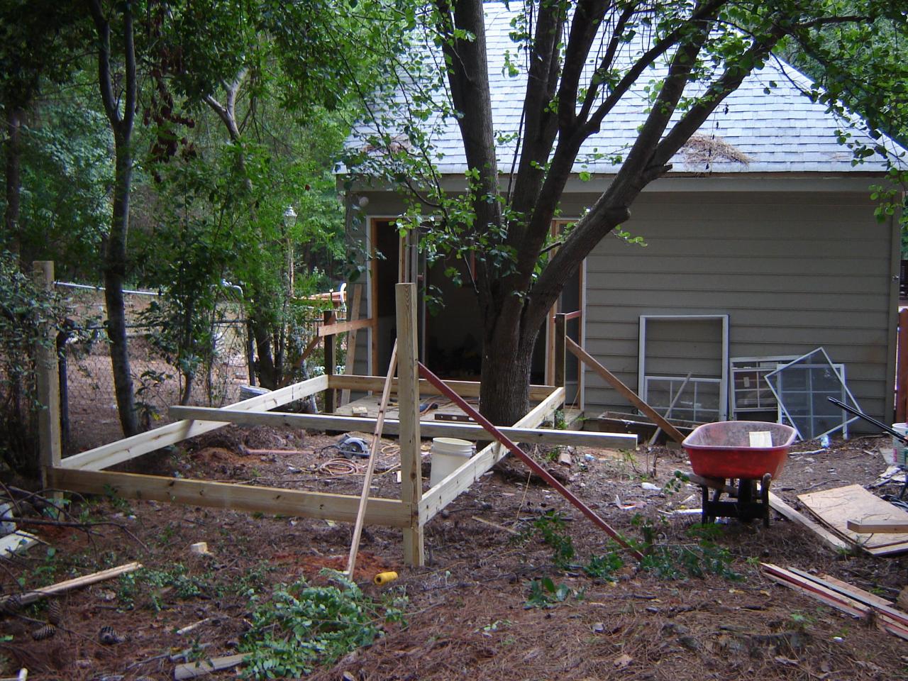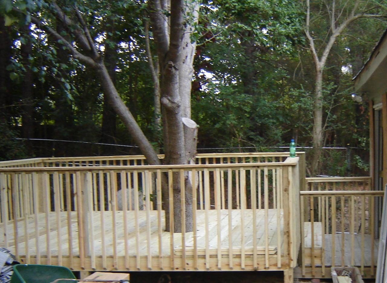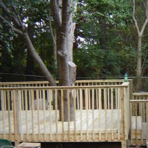 The "Before" image shows the layout for the new deck that will connect to the pool house. The "After" image shows the completed deck encompassing the tree which will provide shade on the area.