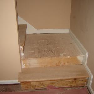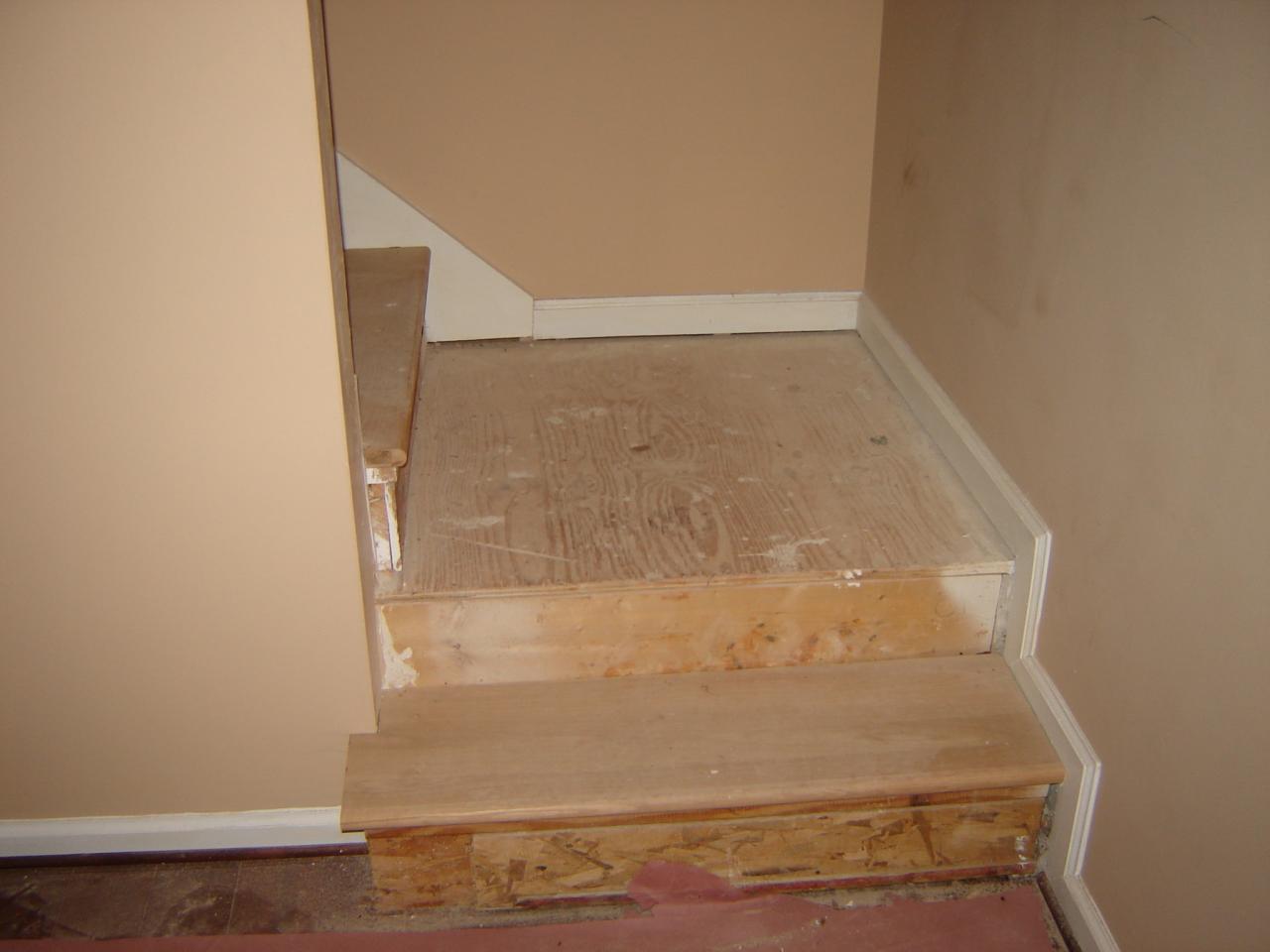 The "Before" image shows stairway landing after original carpet was removed. The "After" image shows the same stairway landing completed with engineered hardwood risers and landing and stained treads.