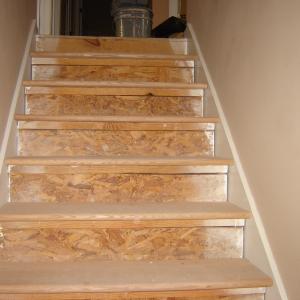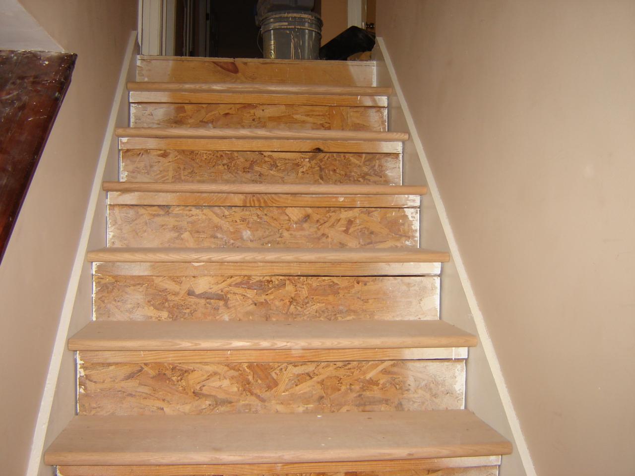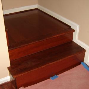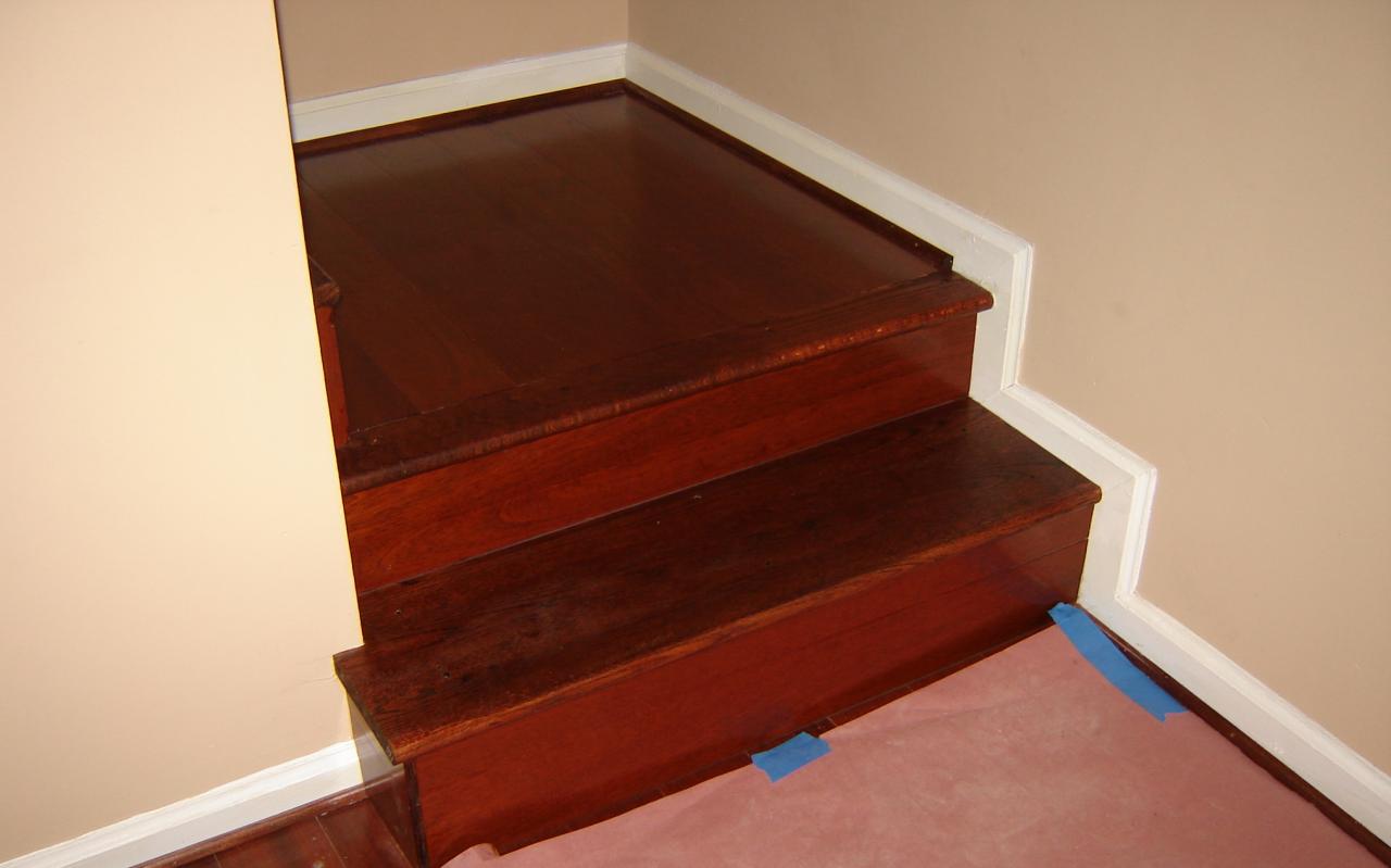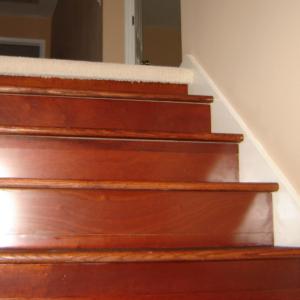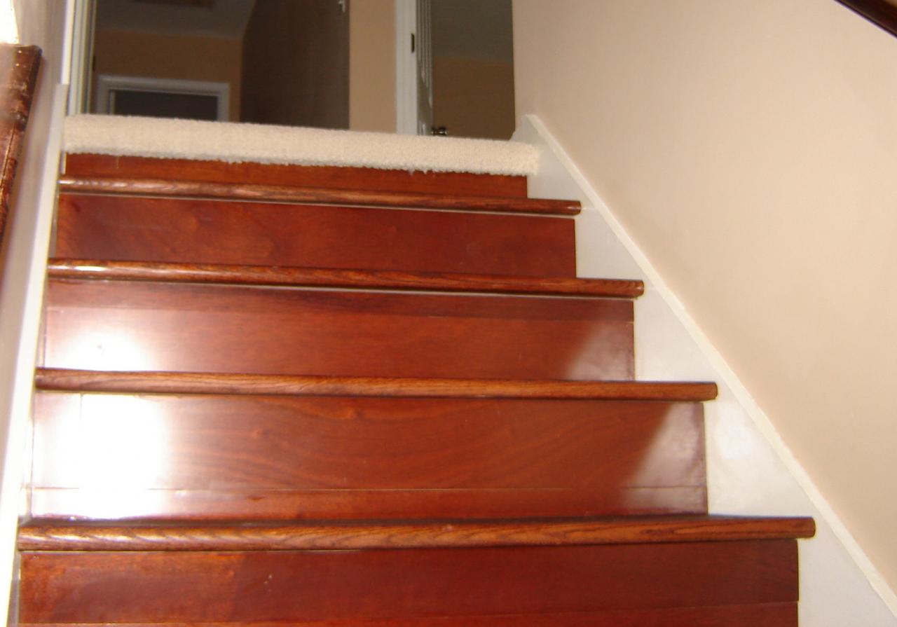 The "Before" image shows stairway after original carpet covering was removed. The "After" image shows the stairway finished with engineered hardwood risers and stained treads.