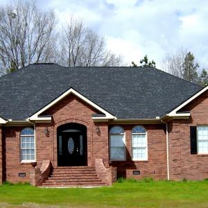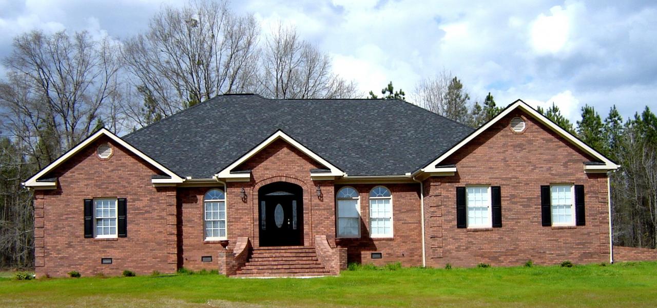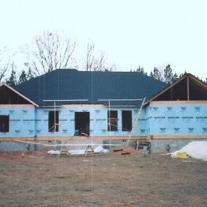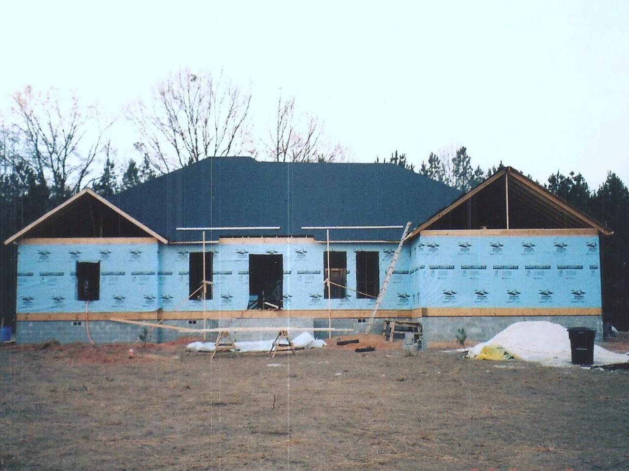 New construction of approximately 3700 sq. ft. ranch style home. The "Early Stage" photo shows house with crawl space completed, weather wrapping installed and roof constructed with felt covering. The "Final Stage" photo shows the house with porch added, front door installed, brick work complete and architectural asphalt shingles laid.
