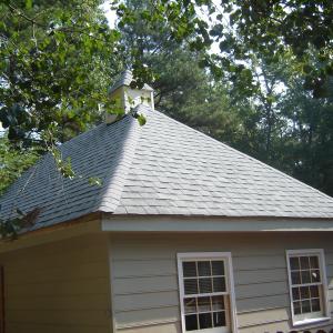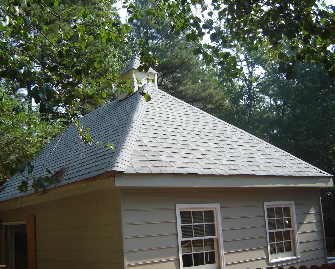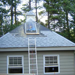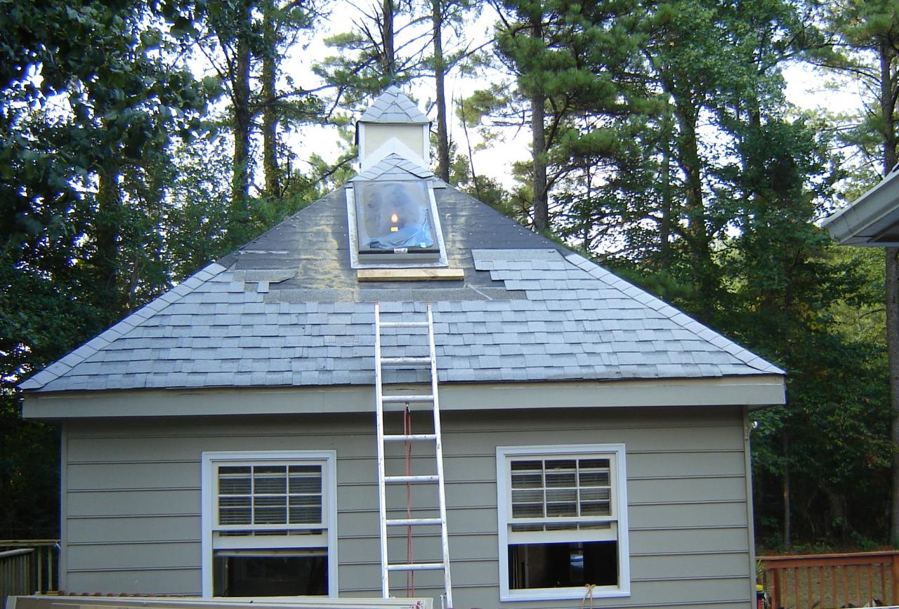 The "Before" image shows the roof of this pool house with asphalt shingles only. The "After" image shows some of the shingles pulled away and a skylight installed to allow more natural light into the space. The shingles were replaced to surround the skylight.