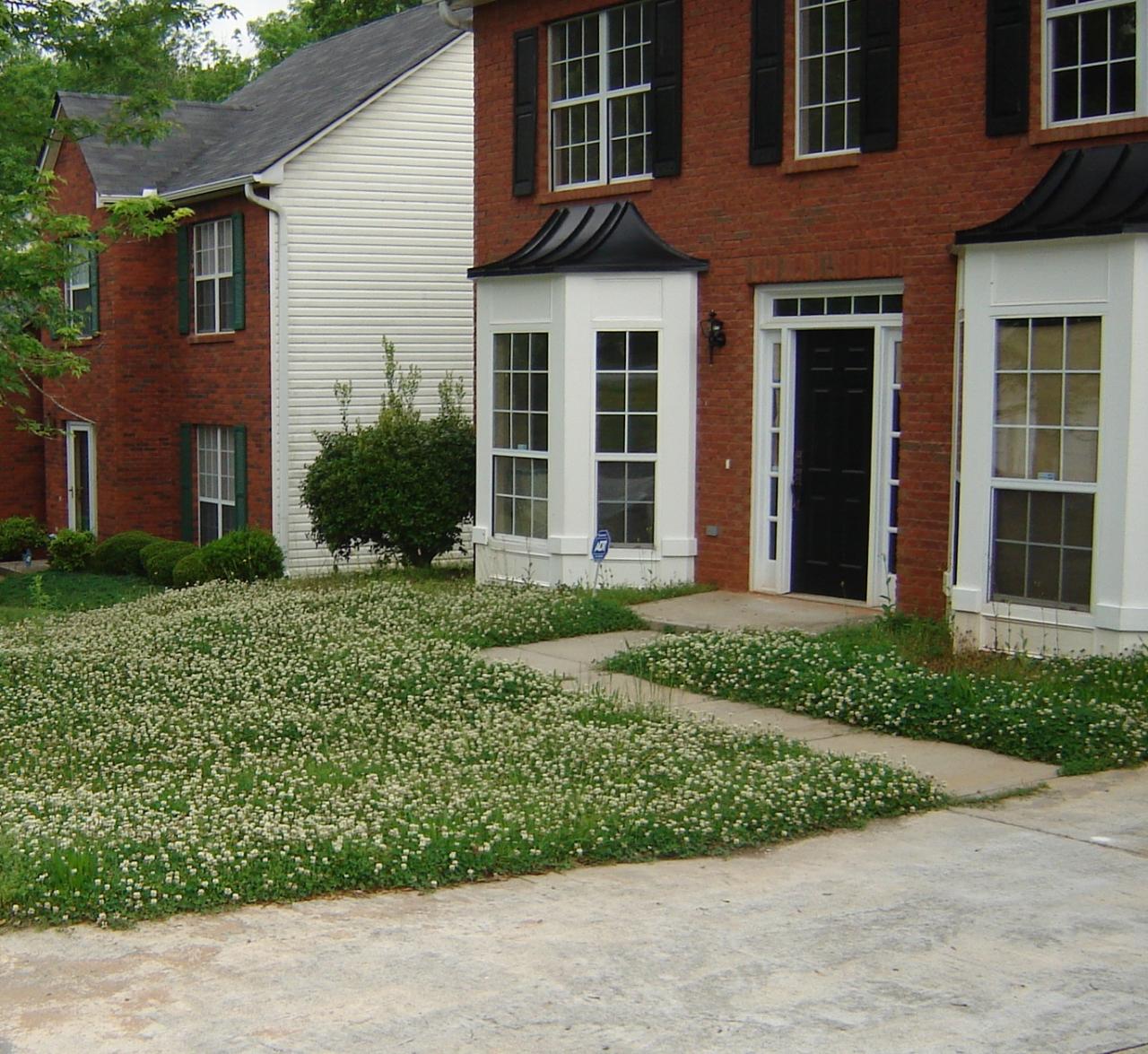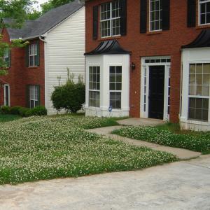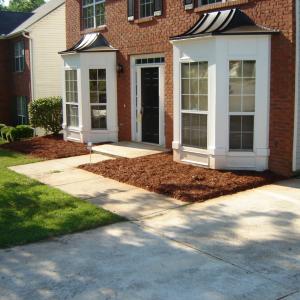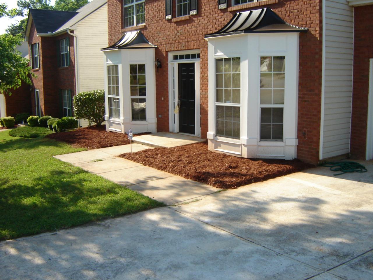 The "Before" image shows the lawn and flower beds overtaken by weeds and dandelion. The "After" image shows the lawn after it has been treated with weed remover and cut. Also, grass and roots were removed from the flower bed areas around the bay windows and an underlayment installed to prevent weed re-growth and covered with decorative red mulch.
