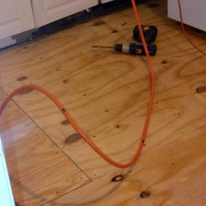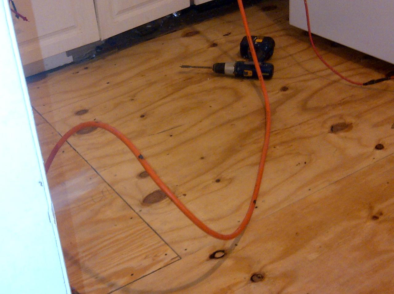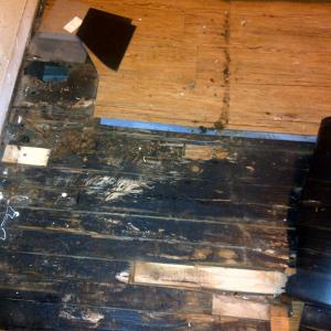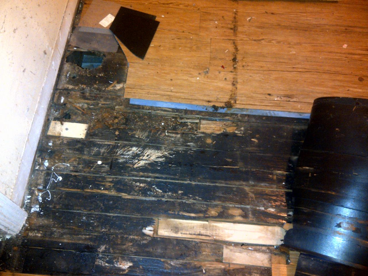 The "Before" image shows rotten sections of the horizontal sub floor boards. In the "After" image the rotten sub floor has been removed and a new plywood sub floor has been installed.