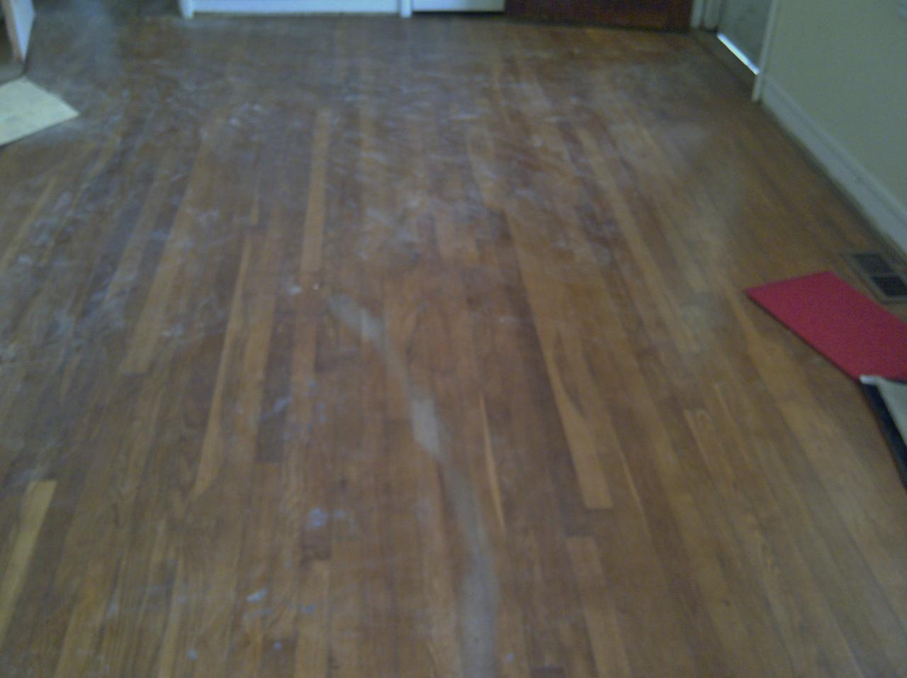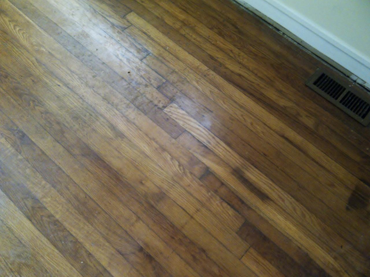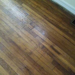In the "Before" picture, the hardwood floors were scratcheed, scuffed and dirty. The "After" image shows the same floors after they have been stripped, restained and coated with polyurethane.