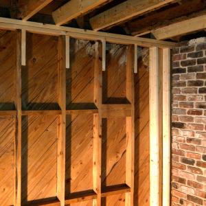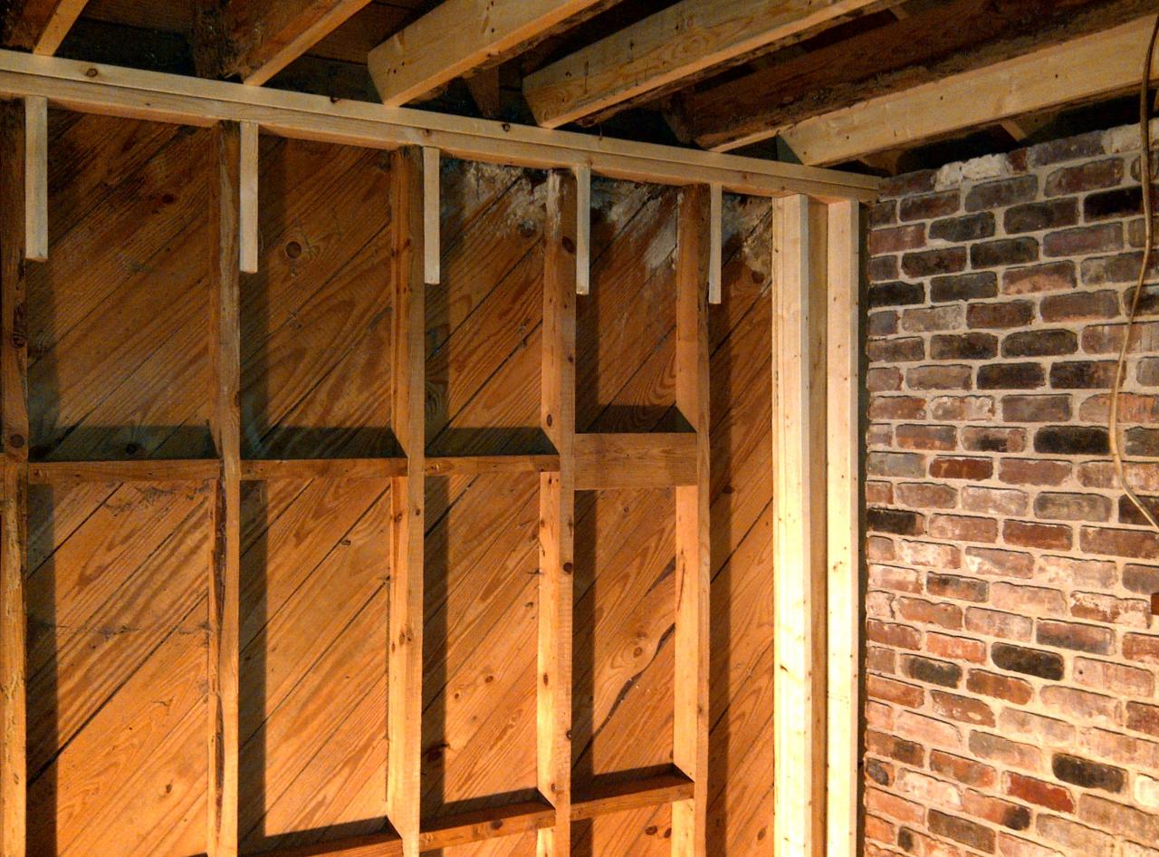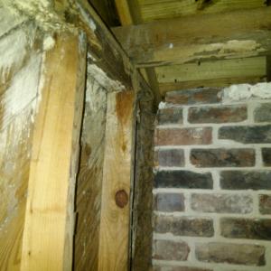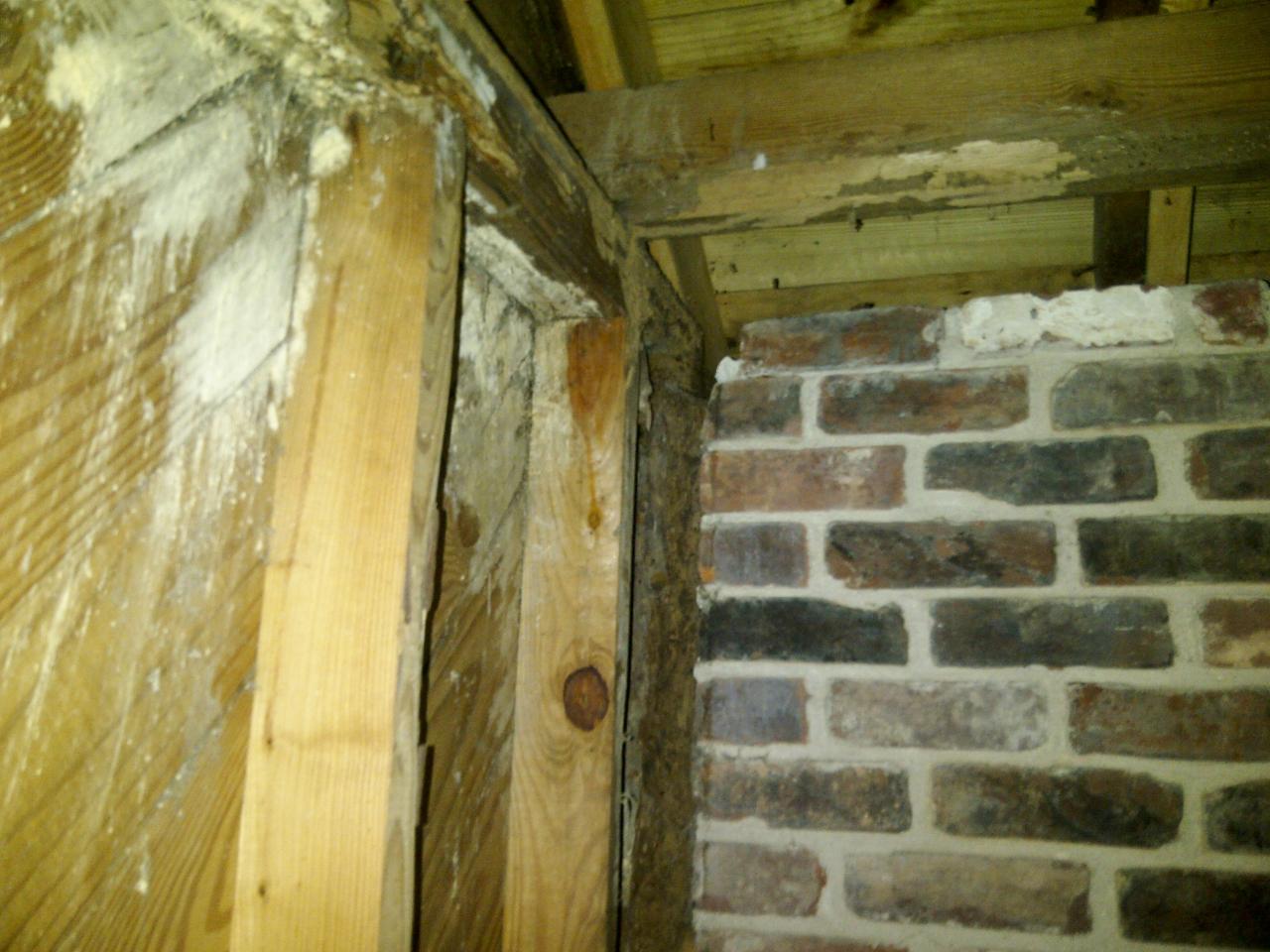 The "Before" image shows the rotting wood top plate and wall studs. In the "After" image new wood top plate (doubled) and wall studs were installed and other wall studs were reinforced.
